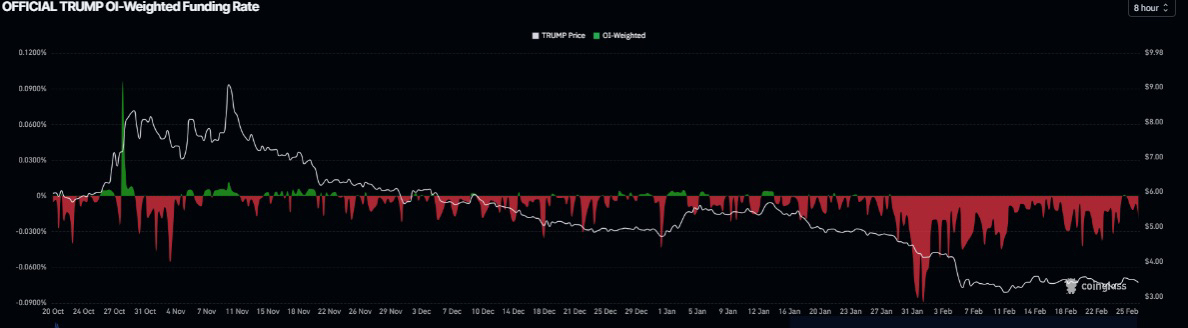 تدعم بيانات المشتقات لـ $TRUMP تحيزًا هبوطيًا. تحول معدل تمويل عملة الميم إلى السلبية يوم الأربعاء ويقف عند -0.019% يوم الجمعة، وفقًا لـ CoinGlass. تشير هذه المقياس السلبي إلى أن المراكز القصيرة تدفع للمراكز الطويلة، مما يشير إلى معنويات هبوطية تجاه ترامب الرسمي.