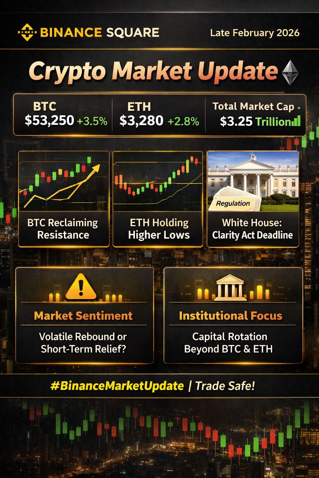 Posts tagged #post show traders focusing on BTC reclaiming resistance levels and ETH holding higher lows, with total crypto market cap pushing toward ~$3.25 trillion and hopes of stabilization if support holds. �