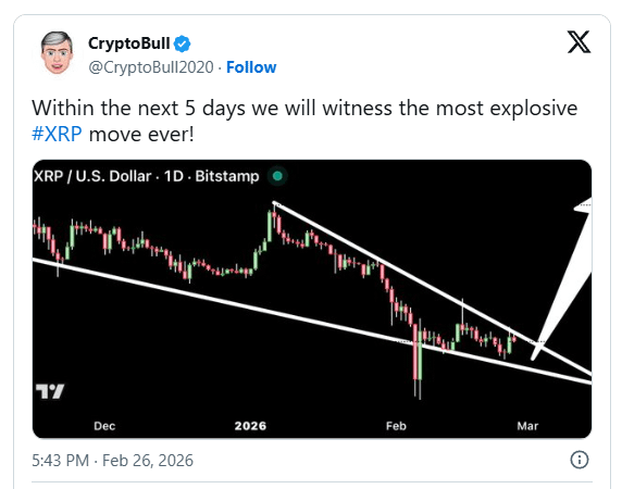 Analiza kryptowalut CryptoBull ostatnio wzbudził dyskusję na X, ogłaszając, że XRP może zrealizować swój najbardziej wybuchowy ruch w ciągu pięciu dni od 26 lutego 2026 roku. Jego post zawierał wykres świecowy 1D, który sugeruje potencjalną strukturę odwrócenia, tworzącą się po tym, jak XRP osiągnął dno w grudniu 2025 roku.