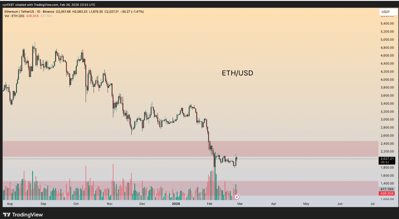 Szerszy wzór pokazuje, że Ethereum unosi się blisko 2 000 USD po załamaniu wsparcia trwającym kilka miesięcy, przechodząc od szczytów powyżej 4 000 USD przez wiele poziomów wsparcia. Słupki wolumenu wskazują na zwiększoną aktywność podczas ruchu w dół, a następnie na niższą zmienność podczas ostatniej stabilizacji. Wygląda na to, że sprzedający tracą kontrolę, gdy ETH utrzymuje się powyżej tej psychologicznej granicy, uniemożliwiając kontynuację głębszych strat poniżej regionu 1 900 USD.
