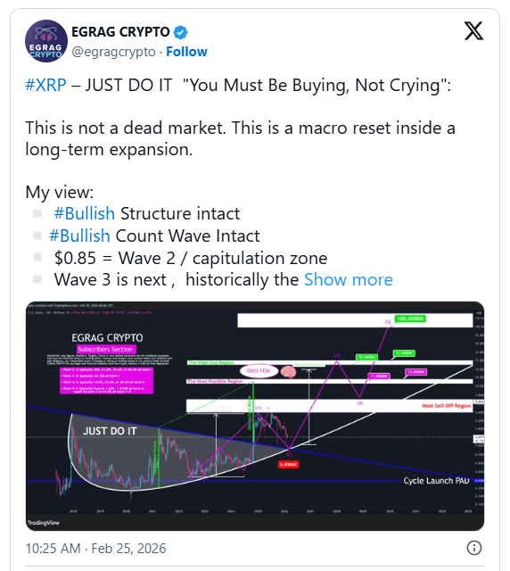 Zgodnie z EGRAG CRYPTO, XRP niedawno przetestowało poziom $0.85, zidentyfikowany jako Fala 2 lub strefa kapitulacji. Jest to historycznie silny punkt resetowania, gdzie następuje akumulacja przed wzmocnieniem rynku.