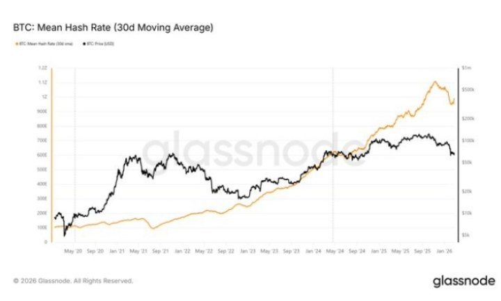 Bitcoin’s 30-day mean hash rate stands near 0.99 ZH/s after peaking at 1.10 ZH/s in November 2025. Both hash rate and price have moved lower in recent weeks.