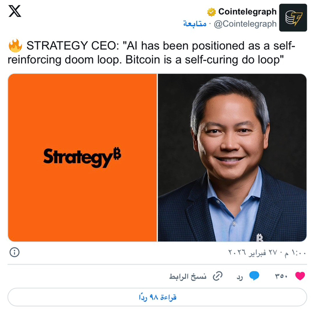 Debata między bitcoinem a sztuczną inteligencją pojawiła się częściowo w tym klimacie przesyconym obawami. Jeśli sztuczna inteligencja reprezentuje stan przyspieszonej niepewności, rynki szukają elementu, który można przewidzieć. Dyrektor generalny Strategy przedstawił bitcoin jako siłę równoważącą. Opisał jego projekt jako przejrzysty i oparty na jasnych zasadach i ograniczeniach matematycznych.