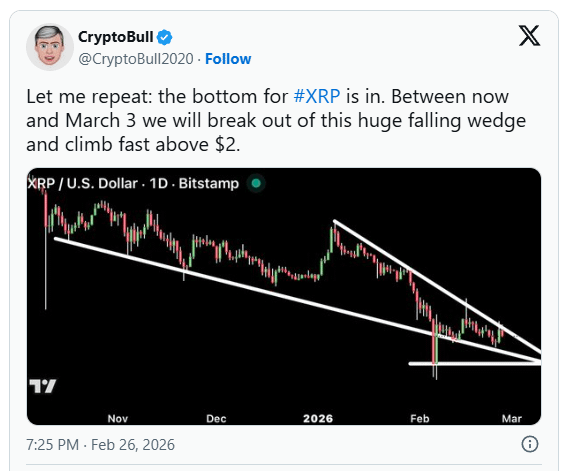 Crypto analyst CryptoBull recently stated on X that XRP has already printed its cycle bottom near $1.40. He argued that the price will break out of a massive falling wedge pattern on the daily chart and surge above $2 before March 3, 2026. His accompanying TradingView chart outlines a clear wedge structure that has developed since November 2025.