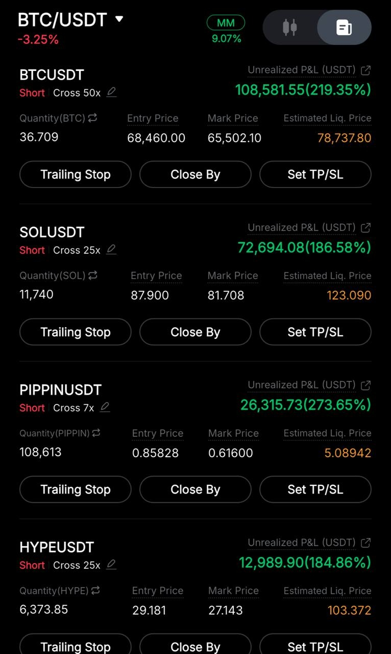 Multiple shorts aligned perfectly with the overall market weakness. When the higher timeframe structure shifts and liquidity starts getting taken, you don’t fight it — you position yourself with it.