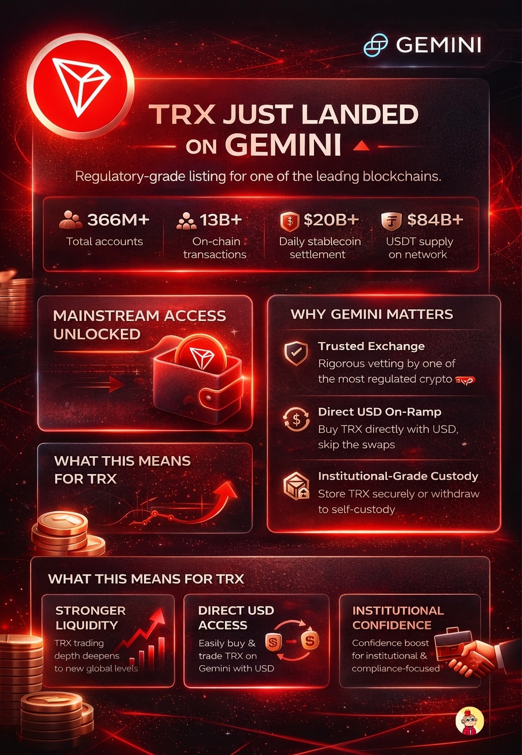 $TRX has officially gone live on Gemini, with deposits and withdrawals fully enabled, and this is bigger than just another exchange listing.