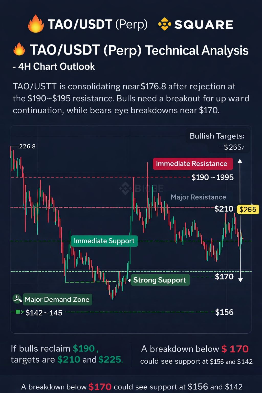 Jeśli $TAO utrzyma się powyżej $170 i odzyska $190 z silnym potwierdzeniem wolumenu, możemy zobaczyć byczą ekspansję w kierunku $210, a potencjalnie $225. Jednakże, spadek poniżej $170 zwiększa prawdopodobieństwo ponownego testu $156, a niepowodzenie tam może otworzyć drogę do głównego popytu na $142.