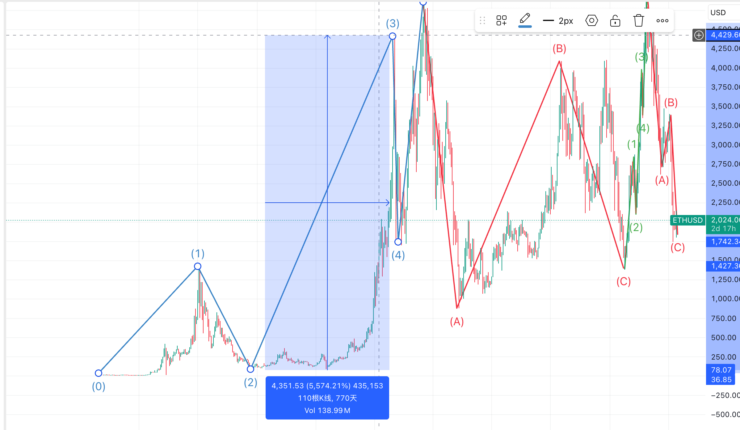因为以太坊一浪的三浪真的很疯狂,以太坊在一浪内部的三浪在两年内上涨55倍.三浪三一般情况下都是最疯狂的上涨类型.所以我们的三浪三至少有5500u的上涨预期,1740u做底部三浪至少要涨到7240U.如果用比例来推演就是 1740*55 = 95700U,如果刻舟求剑2028年的eth至少会在7240u-95700u之间.同时四浪不能跌破一浪顶部,那么四浪的回调地点可能潜在位置就是4900,喜欢波段的选手可以在4900以上定抛在2028年.定抛周期为一年.