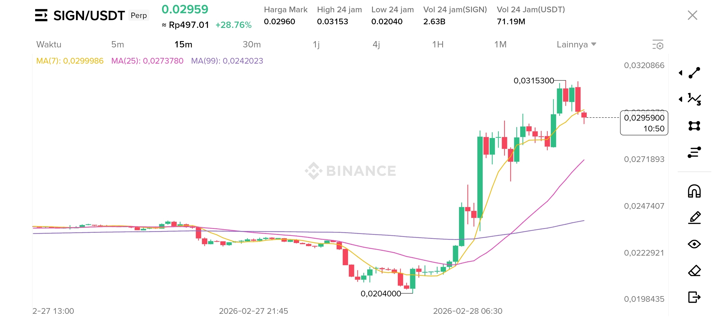 Di tengah pemulihan pasar cryptocurrency secara keseluruhan, SIGN menunjukkan performa yang mengesankan. Per 28 Februari 2026, token SIGN mencatat kenaikan 20,12% dalam 24 jam, diperdagangkan di harga 0,03 dolar AS, dengan kapitalisasi pasar mencapai sekitar 46,9 juta dolar AS. Kenaikan ini bukan sekadar didorong oleh sentimen pasar, melainkan merupakan pelepasan nilai di bawah berbagai sentimen positif seperti implementasi aplikasi tingkat nasional, perluasan ekosistem, dan inovasi teknologi dari proyek Sign.