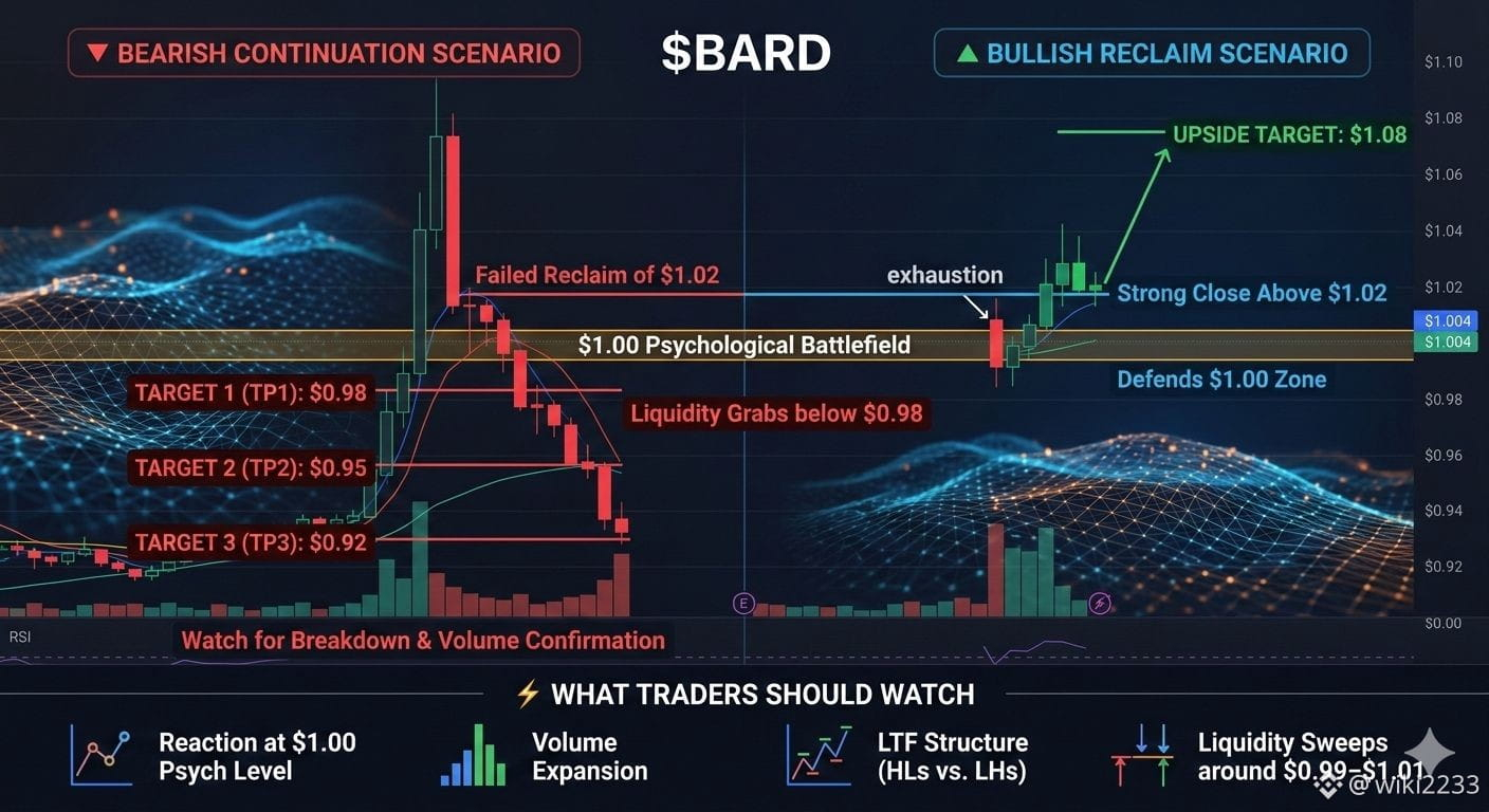 $BARD just delivered a clean bounce into the psychological $1.00 area and is now hovering near $1.004, showing early signs of short-term exhaustion after the impulse move ⚖️