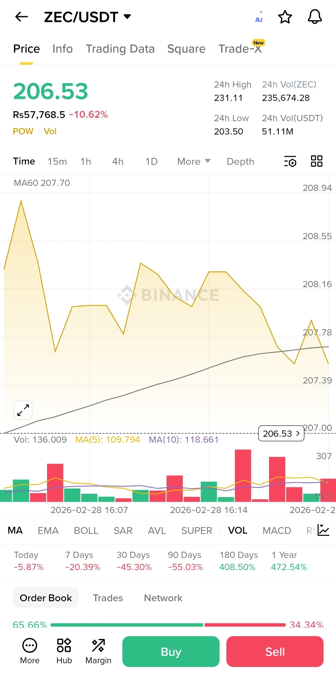 Zcash ($ZEC ) is currently trading around $206.74 after a sharp rejection from the $244 high — a decisive bearish displacement that flushed weak hands from the market. Price wicked down to $203.50, and while the 1H chart shows minor consolidation, the broader intraday structure remains tilted to the downside.