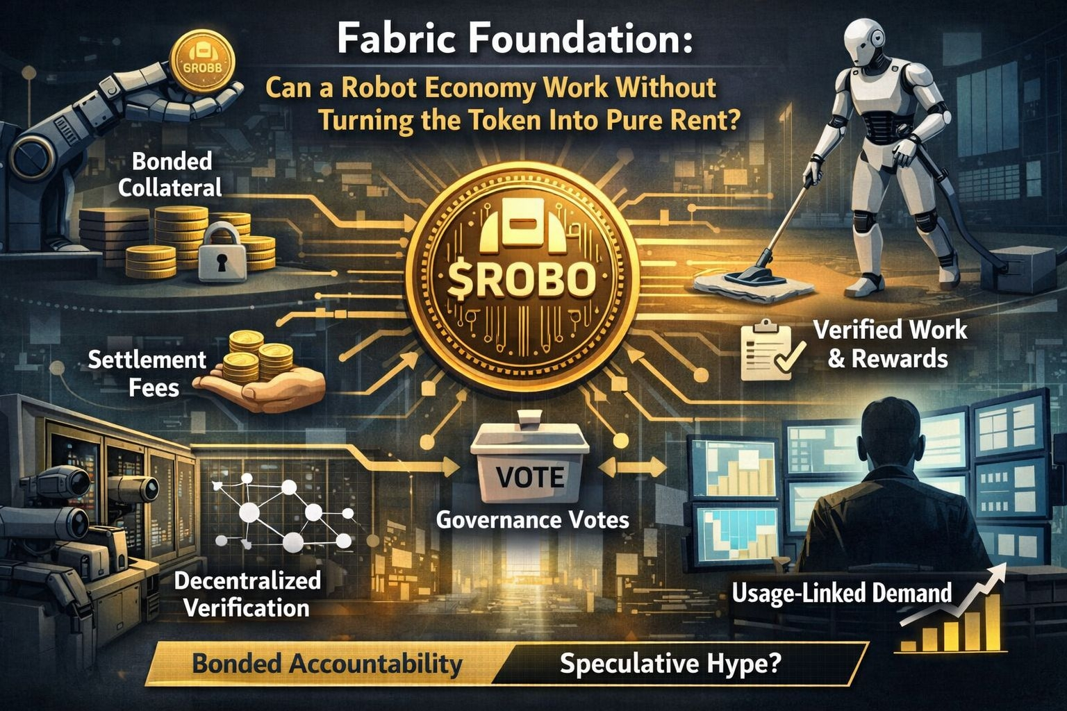 My practical rubric for robotics tokens is simple.If the token only sits at the edge of the system, I lose interest.If the token is required everywhere, I get cautious.Fabric caught my attention because it is trying to sit in the uncomfortable middle. Not a meme wrapper around AI. Not a pure payments coin either. ROBO is supposed to secure robot operators, settle work, gate participation, coordinate governance, and reward verified contribution - all without becoming a passive yield story. That is a serious design ambition. It is also where most projects become messy.Fabric’s real bet is not “robots on blockchain”; it is that a robot network can tie token demand to actual work while making bad behavior economically expensive.Fabric does not position ROBO mainly as a speculative asset. It positions it as operating collateral for a machine economy. Robot operators post refundable performance bonds to register hardware and provide services. Tasks generate fees. Validators check outcomes. Contributors are rewarded only when work is verified. In theory, this creates a loop where usage creates demand, and misconduct destroys value through slashing and suspension.