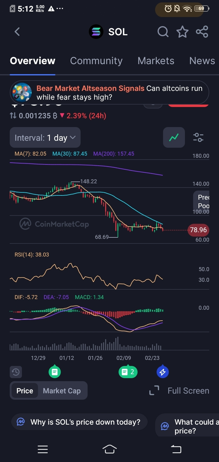 $SOL Cena handluje poniżej wszystkich głównych średnich kroczących (7, 30, 200), potwierdzając niedźwiedzią strukturę na dziennym interwale czasowym. Średnia 200 MA na poziomie 157.45 znajduje się daleko powyżej, działając jako długoterminowy opór. Jednak momentum pokazuje wczesne oznaki wyczerpania na dole.