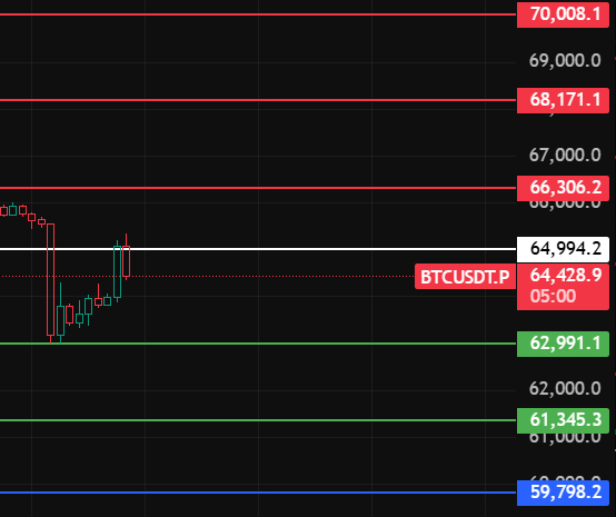 Bitcoin w nocy zwróć uwagę na poziom 65000, tylko zamknięcie powyżej tego poziomu przez 1-2 godziny może rozpocząć rebound, zwróć uwagę na opory w pobliżu 66300-68170-70000!
