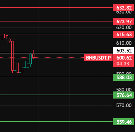 BNB w nocy zwróć uwagę na poziom 603, tylko zamknięcie powyżej tego poziomu przez 1-2 godziny może rozpocząć rebound, zwróć uwagę na opory w pobliżu 615-624-632!