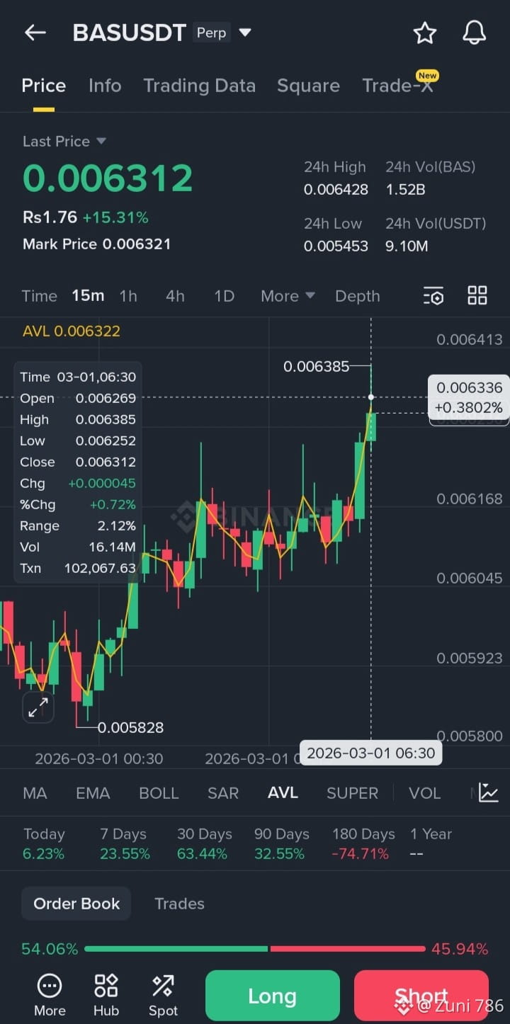 The $BAS /USDT perpetual pair is showing strong upward strength today, currently up +15.31%. Looking at the 15m chart, we are seeing a series of higher highs and higher lows, with the price successfully breaking above the 0.006200 consolidation zone.