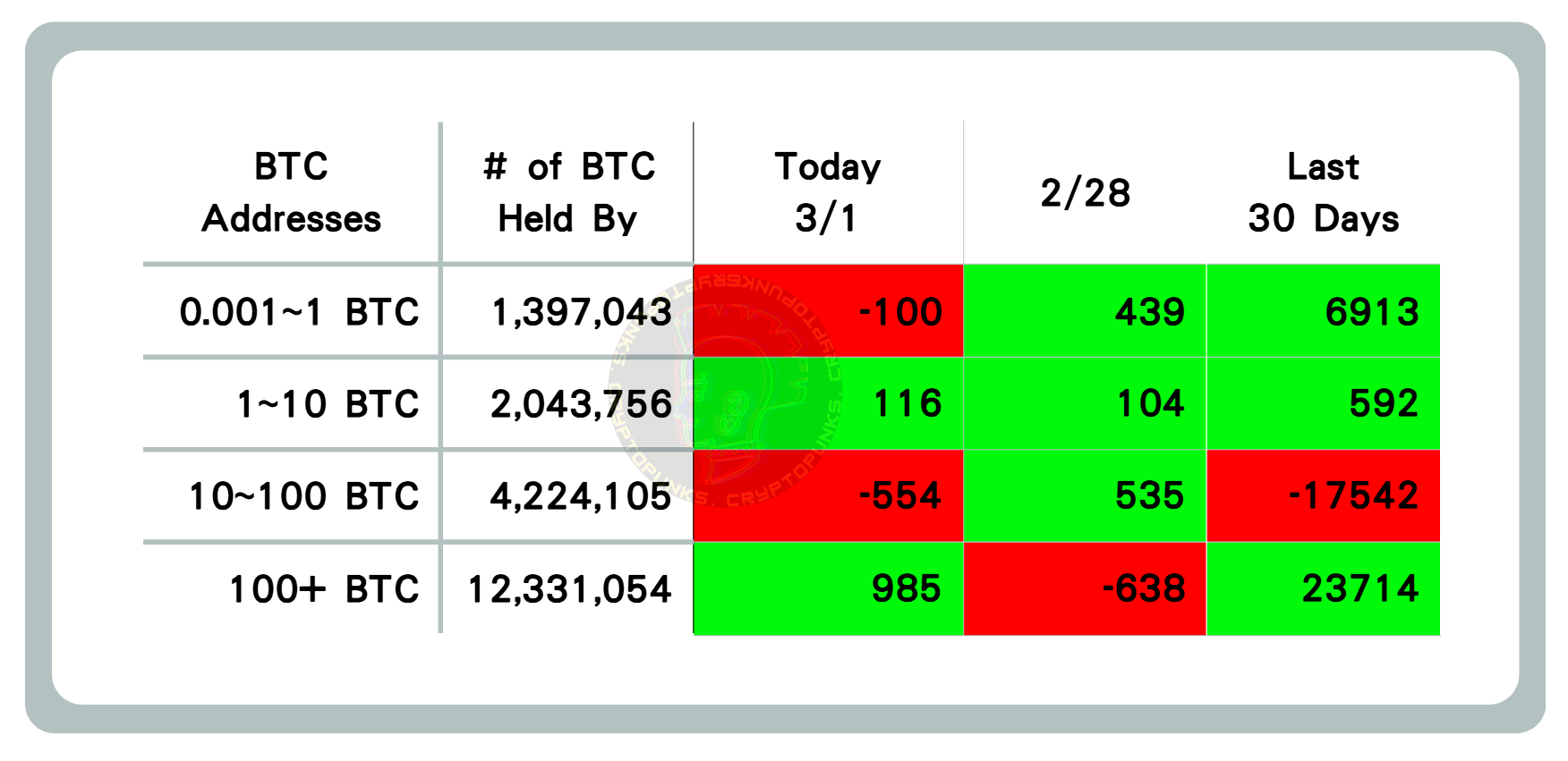 Dane: (Rysunek 3) 100+ dużych graczy wczoraj -638, dzisiaj +985, w tym tygodniu łącznie +3623, w lutym łącznie zakupiono +23,714 BTC, co jest dość dobrym wynikiem, jest to znaczny wzrost w porównaniu do zeszłego miesiąca, jednak głównie skupia się to na początku lutego w okresie nagłego spadku z 60000~65000