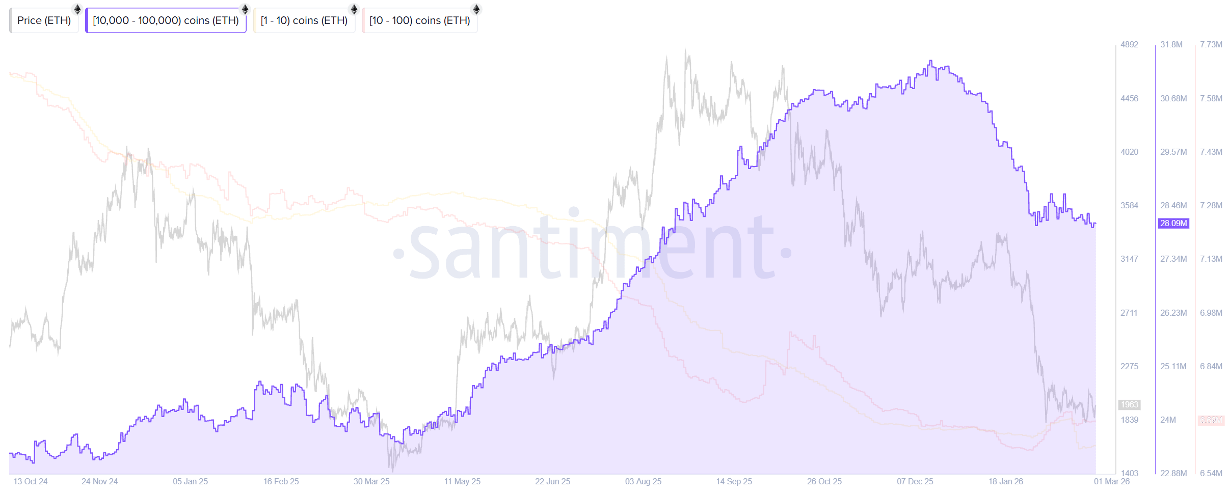 Obecnie ETH (10,000~100,000) całkowita ilość posiadana przez dużych graczy zasadniczo nie zmieniła się w ostatnich tygodniach, staking Bitmine wydaje się być zakończony, z przerwą trwającą około 3 tygodnie, więc odliczając Bitmine