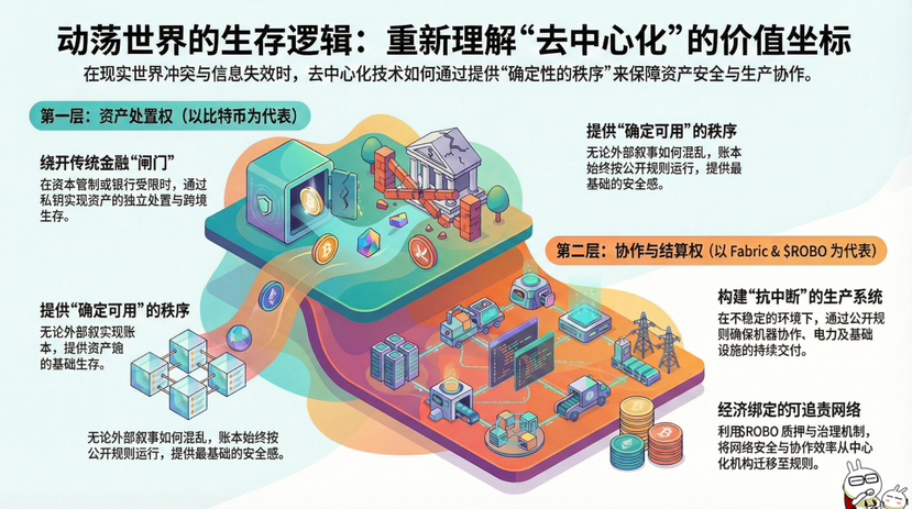 所以这里我想表达的是真正触发的,不是币圈又多了一个热点,而是现实世界在逼你重新理解去中心化的价值坐标:第一层是资产处置权(BTC),第二层是协作与结算权(像 ROBO这样的机器经济网络)。当信息真空出现、传统闸门收紧,人们先把钱挪出去;而当不确定性常态化,下一步一定是把生产力也迁移到更“抗中断”的系统里。