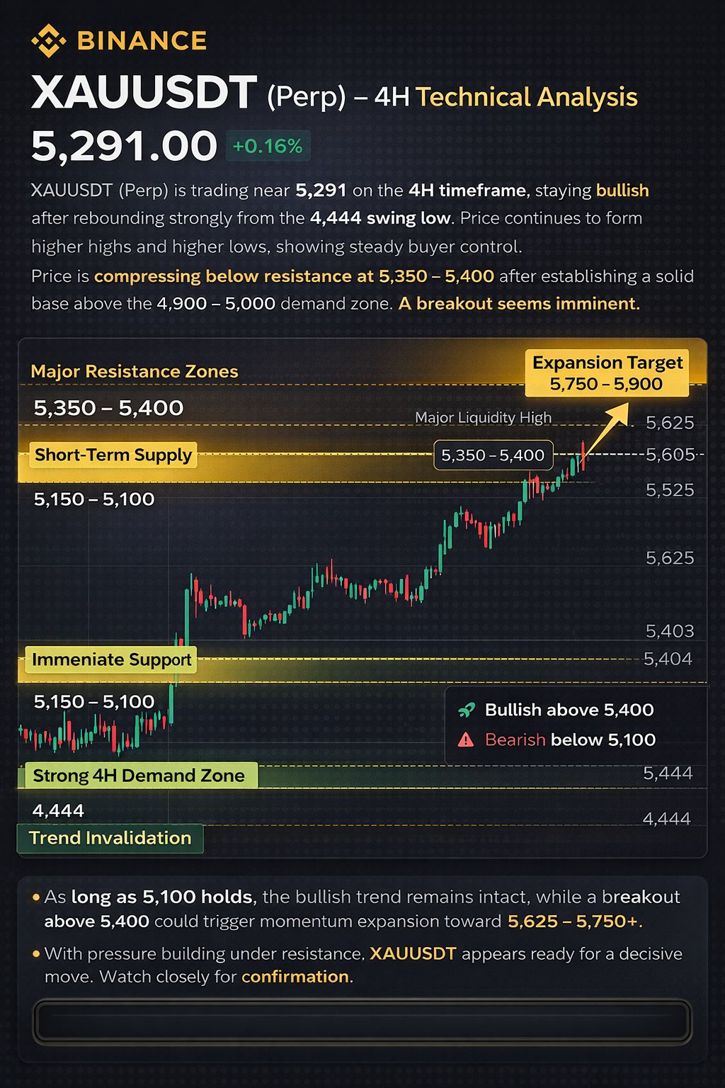 A strong 4H close above 5,400 opens the path toward a liquidity sweep of 5,625. If momentum accelerates, continuation toward 5,750+ becomes highly probable, especially with increasing volume.
