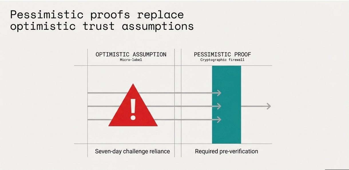 Traditional "optimistic" systems assume everyone is playing by the rules unless someone proves otherwise within a long challenge period (like 7 days). AggLayer's pessimistic proof does the opposite. It assumes every chain might be faulty or malicious and requires cryptographic proof that every cross-chain action is valid before it's accepted.