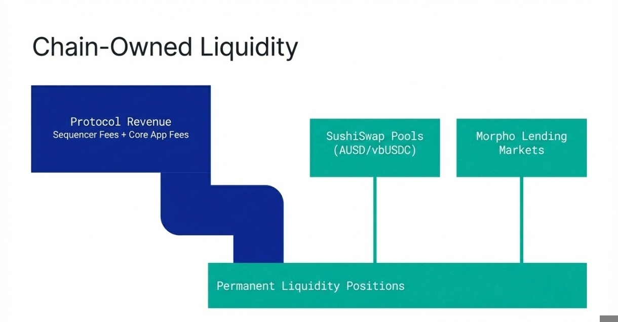 Revenue is Reinvested: A portion of all network revenue, from sequencer fees and core application fees, is automatically reinvested to provide "Chain-Owned Liquidity."