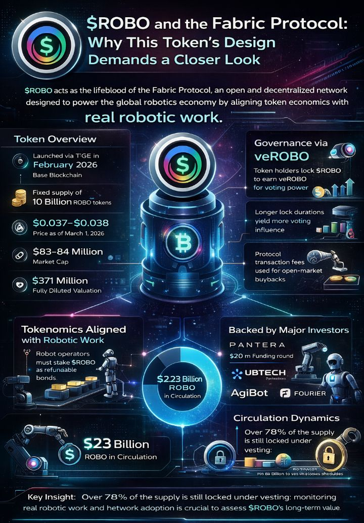 Launched via Token Generation Event in February 2026, ROBO operates on the Base blockchain with a fixed total supply of 10 billion tokens, of which approximately 2.23 billion are currently in circulation. As of March 1, 2026, the token trades around $0.037–$0.038, with a market capitalization near $83–84 million and a fully diluted valuation of roughly $371 million signaling that the market is pricing in significant future network expansion relative to today's liquid supply. The 24-hour trading volume has surged to approximately $120–157 million across 21 exchanges and 47 markets, a figure that substantially exceeds the circulating market cap itself a ratio that points to intense early-stage price discovery rather than settled equilibrium. The token is listed on Binance Alpha, with ROBO/USDT on Bybit registering the heaviest single-pair volume. The Fabric Foundation recently opened a $ROBO claim portal for airdrop recipients, with claims open until March 13, expanding on-chain holder distribution beyond exchange speculation into community participation. What makes these figures analytically interesting is not their magnitude alone, but the structural rationale behind them: roughly 22% of the total supply is currently circulating, meaning over 78% remains locked under vesting schedules including investor tranches subject to a one-year cliff followed by 36-month linear unlocks a dilution risk that any serious observer of this token must track carefully against actual network adoption metrics.