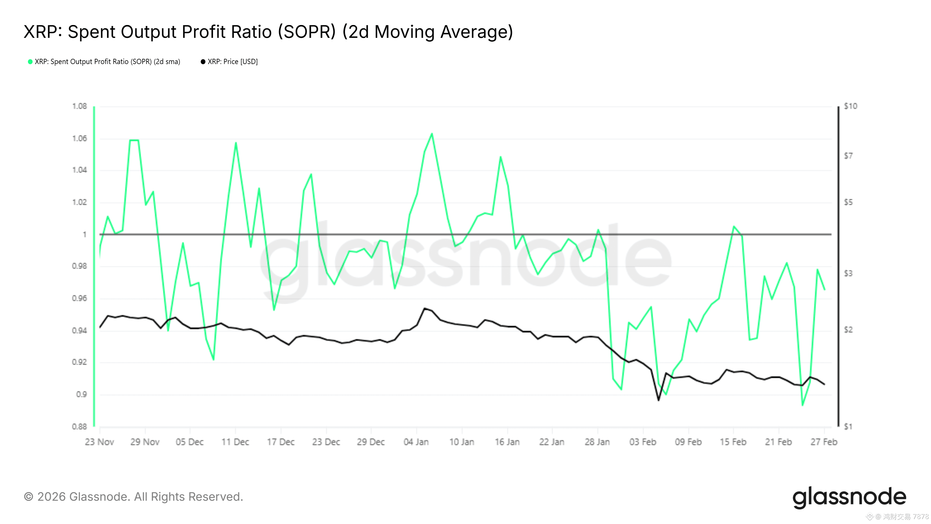 SOPR approaching the 1 level again is significant. A sustained move above this threshold would indicate that coins are being sold at a profit. Historically, this shift often coincides with early recovery phases. If selling continues to saturate, the XRP price may gain room to rebound.