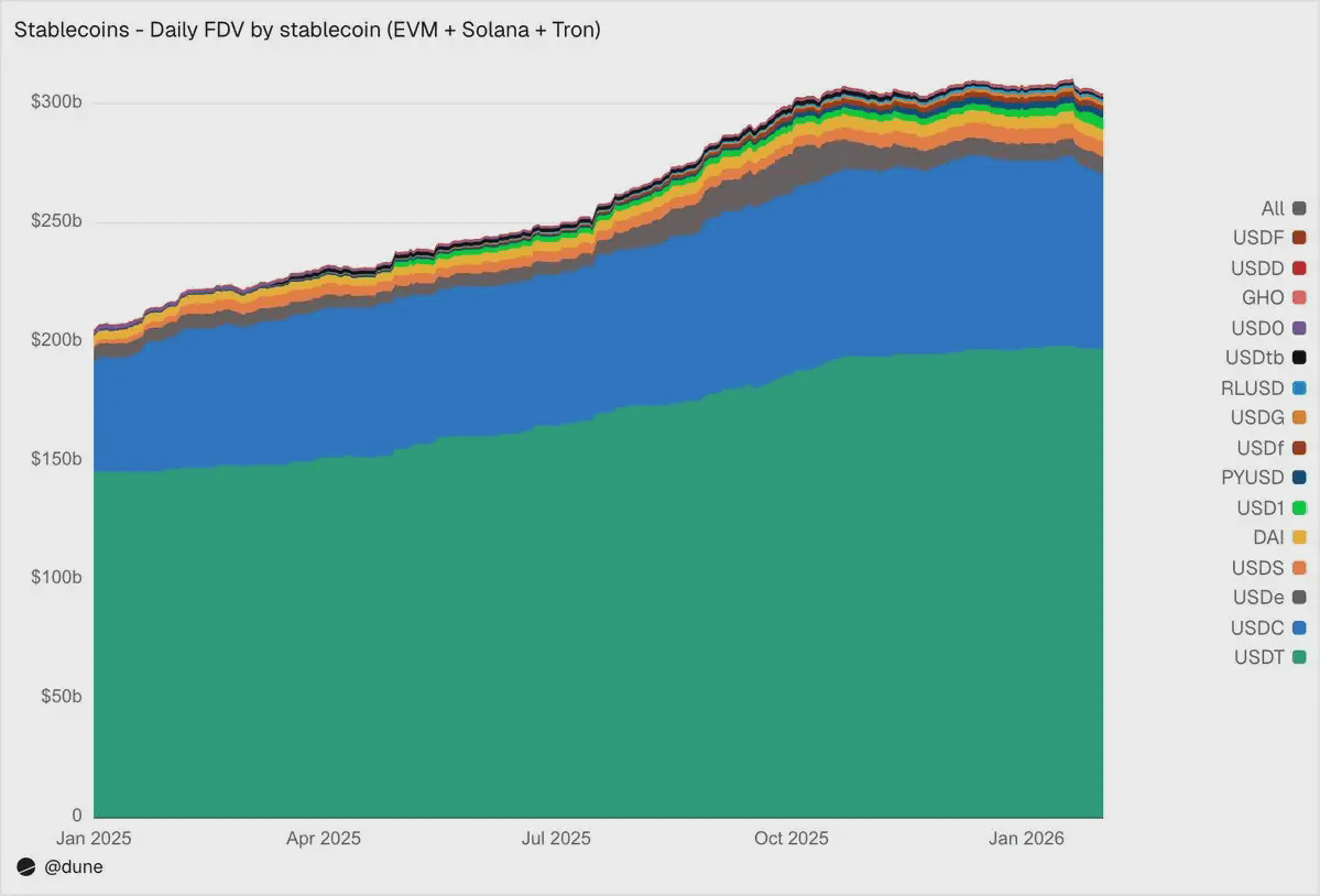 截至 2026 年 1 月,在 EVM、Solana 和 Tron 上规模最大的 15 种稳定币,其完全稀释供应量达到 3040 亿美元,同比增长 49%。Tether 发行的 USDT(1970 亿美元)与 Circle 发行的 USDC(730 亿美元)依然占据 89% 的市场份额。