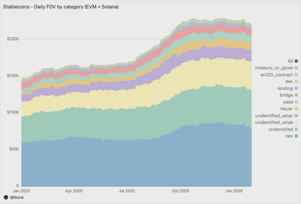 在 EVM 和 Solana 生态中,中心化交易所是目前规模最大的已识别类别,持有规模达 800 亿美元,高于一年前的 580 亿美元。稳定币首先仍然是交易所交易与结算的基础设施。