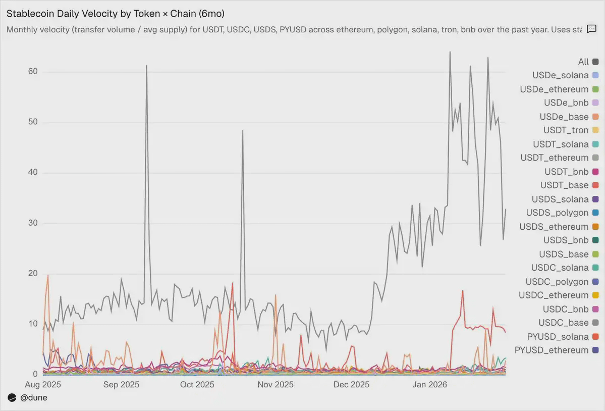 链的差异往往比代币本身更重要。同样是 PYUSD,在 Solana 上日均流通速度为 0.6 倍,是其在 Ethereum 上(0.1 倍)的四倍。同一代币,在不同生态中呈现完全不同的使用模式。
