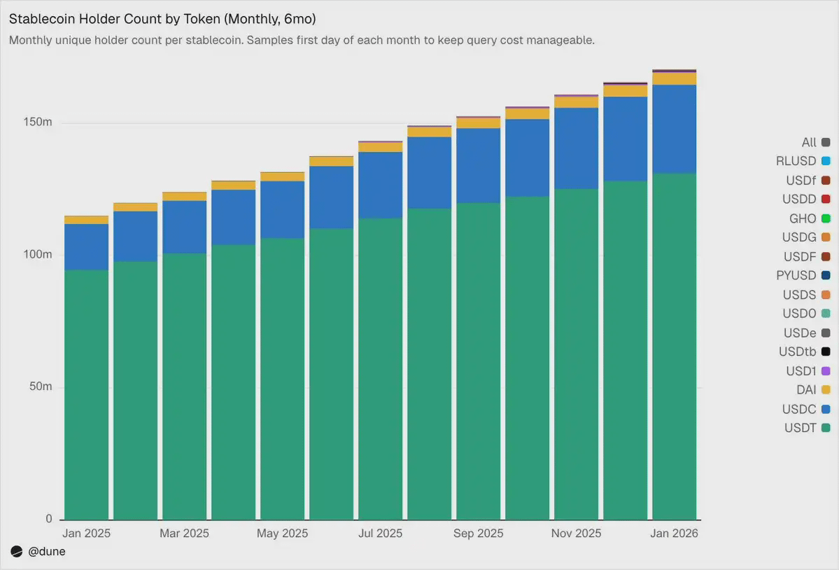 截至 2026 年 2 月,共有 1.72 亿个独立地址至少持有这 15 种稳定币中的一种。USDT 占 1.36 亿,USDC 占 3600 万,DAI 占 470 万。这三种稳定币的分布非常广泛:前 10 大钱包仅持有 23%–26% 的供应量,其 HHI(赫芬达尔-赫希曼指数,0 代表完全分散,1 代表单一持有者)低于 0.03。