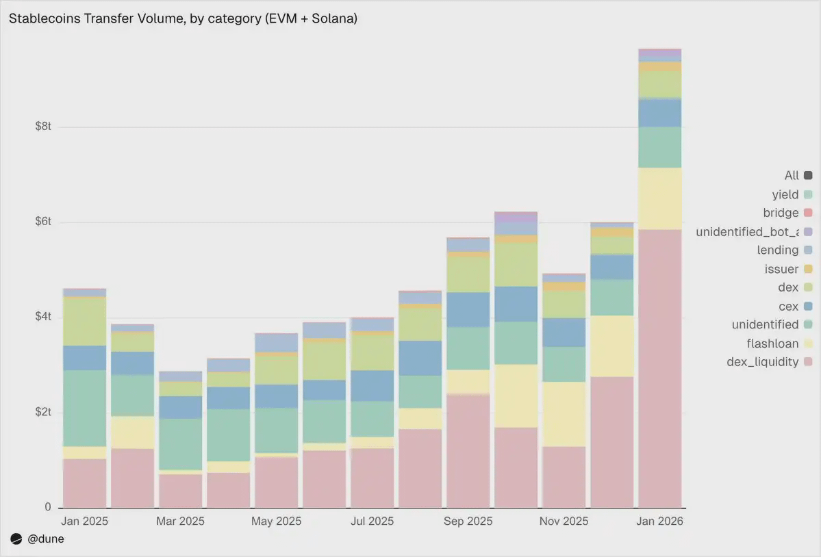 2026 年 1 月,EVM、Solana 与 TRON 生态内稳定币转账总额达到 10.3 万亿美元,是 2025 年 1 月的两倍以上。