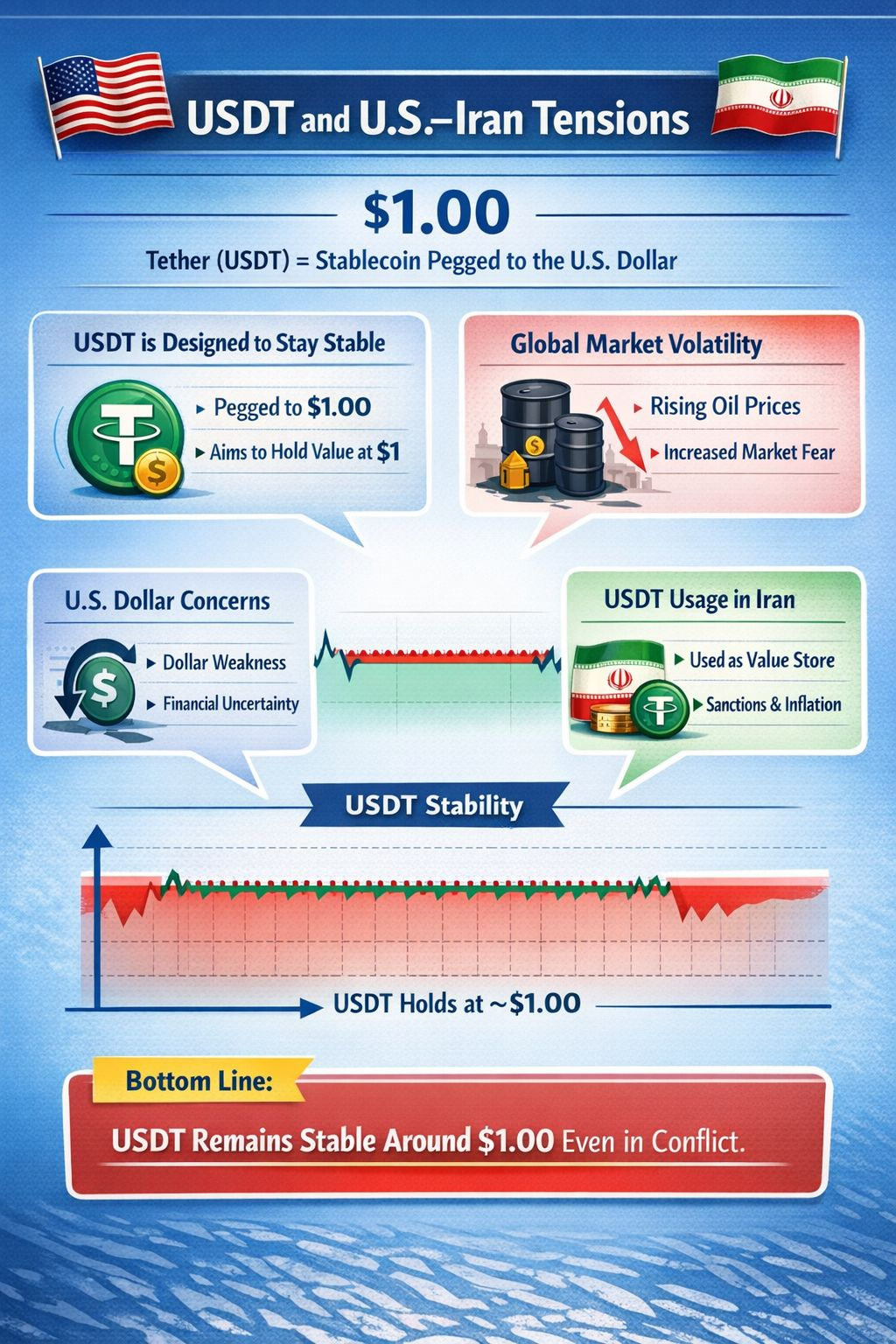 Because of this design, geopolitical tensions like a U.S.–Iran conflict don’t normally make USDT’s exchange rate swing widely like other cryptocurrencies do.