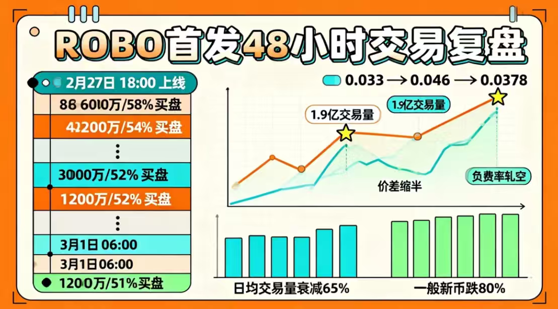 ROBO首发48小时交易量1.9亿,涨幅39%(0.033→0.046),表现中上。
