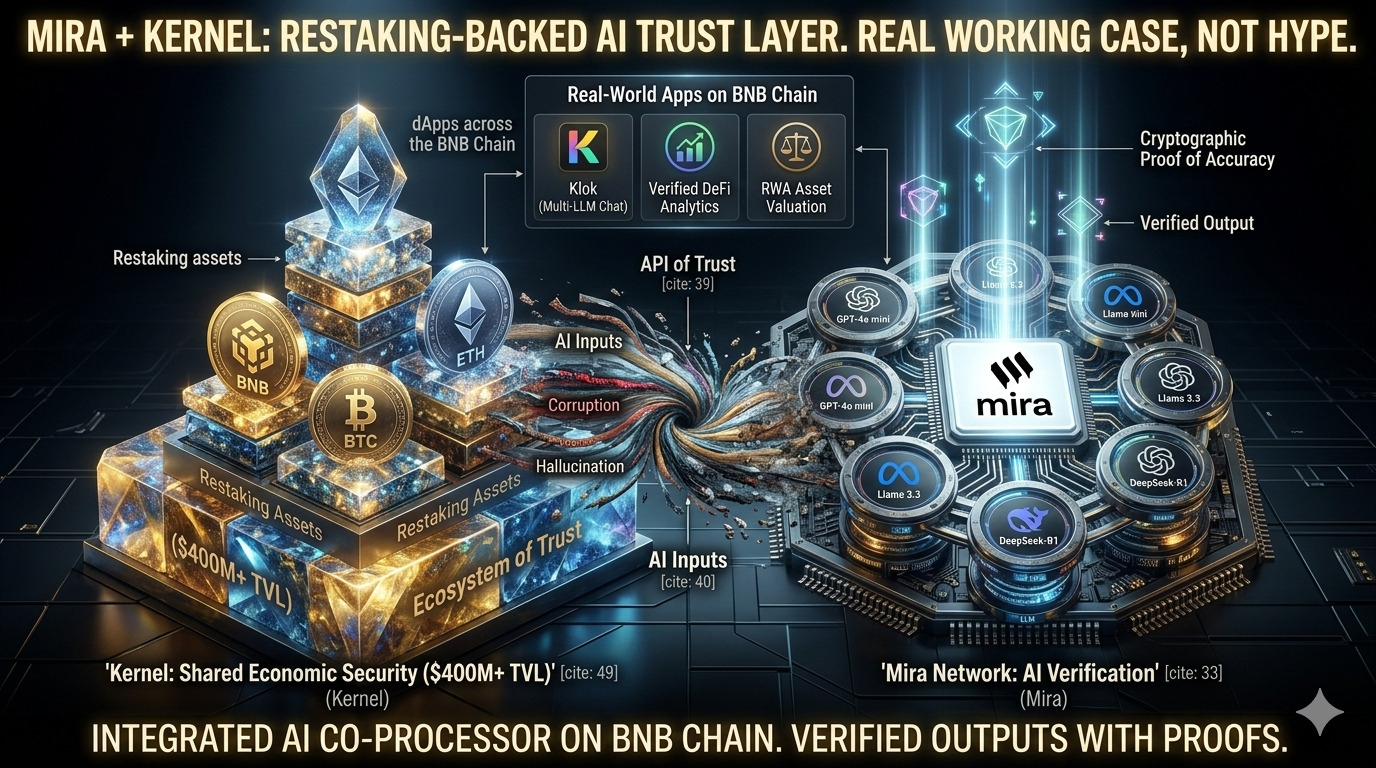 Іноді в Web3 здається, що всі проєкти просто кричать "ми інтегруємось з усіма", а не ділі - порожні анонси. З Mira Network і Kernel на BNB Chain - зовсім інша історія. Це не просто мемо-партнерство. Це #Mira стала офіційним AI co-processor для Kernel, а Kernel - одним з найбільших рестейкінг-протоколів на BNB (TVL понад $400 млн, а в деяких звітах і $2 млрд по всіх чейнах)