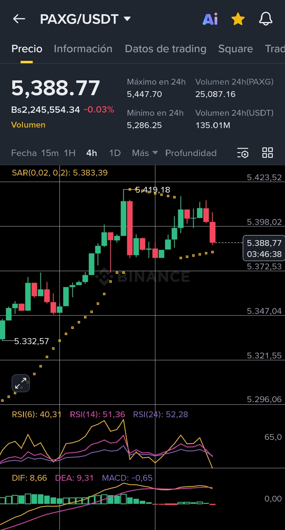 PAXG cotiza actualmente a $5,357 por unidad. Tras haber alcanzado un máximo histórico de $5,619 hace unos días (según datos de Binance/CoinGecko), el mercado ha entrado en una fase de consolidación y toma de beneficios.