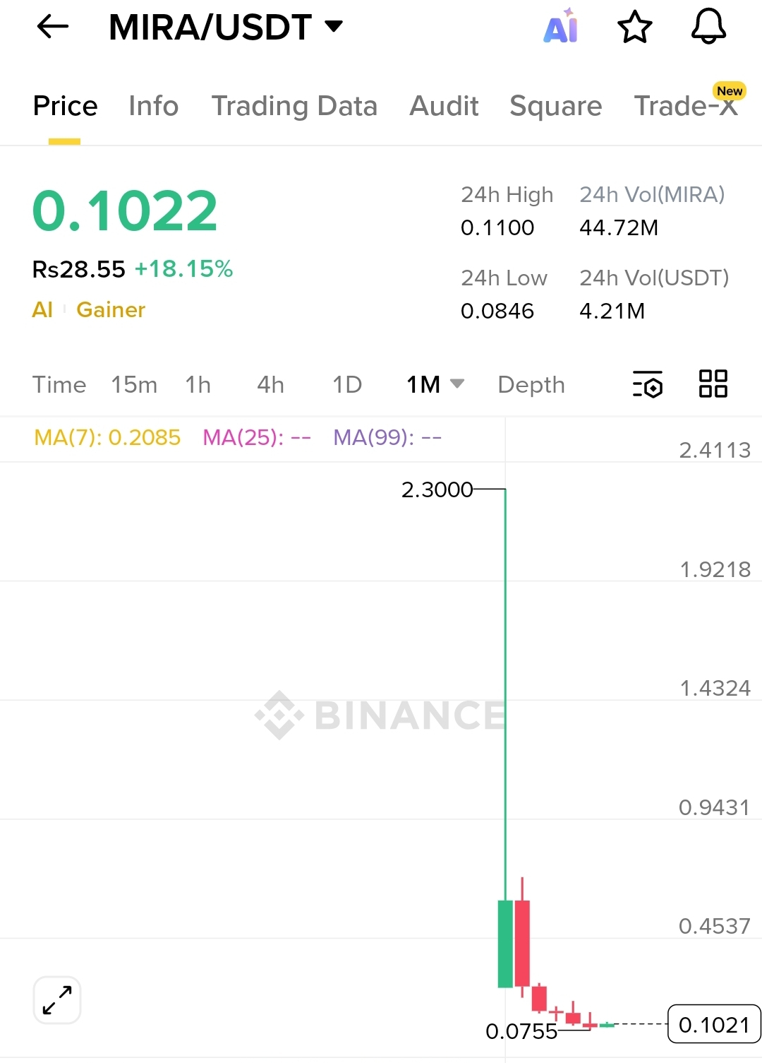 MIRA is showing serious strength on Binance as MIRA/USDT surges to around $0.1022, marking a sharp +18.15% daily gain. The pair stretched between $0.0846 and $0.1100 in the last 24 hours, confirming a major volatility expansion phase. Trading activity has also accelerated, with roughly 44.72M MIRA (~$4.21M USDT) changing hands — a clear sign of growing market participation.