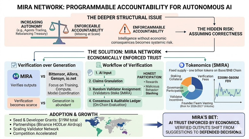 Mira Network is built around that distinction. Its thesis is not that AI will become smarter. It is that trust in AI must be enforced economically. Outputs are decomposed into verifiable claims. Claims are distributed to independent validators. Consensus determines validity. Capital is at risk for dishonesty.
