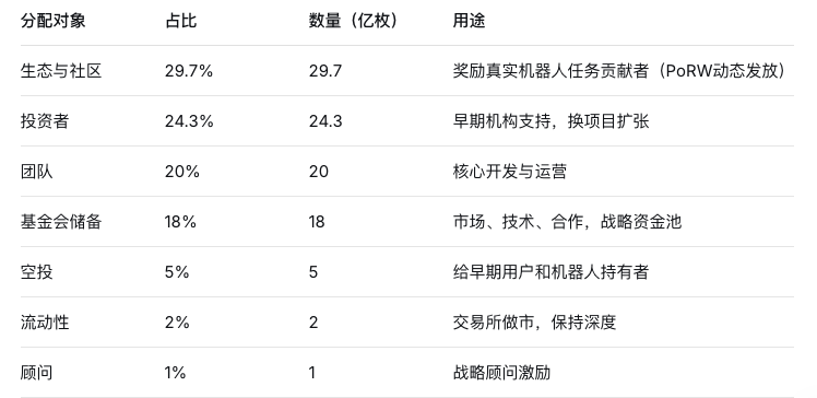ROBO总供应量固定100亿枚,采用Base链的ERC-20标准——以太坊Layer2,成本低、速度快,适合机器人那种高频微交易的节奏。