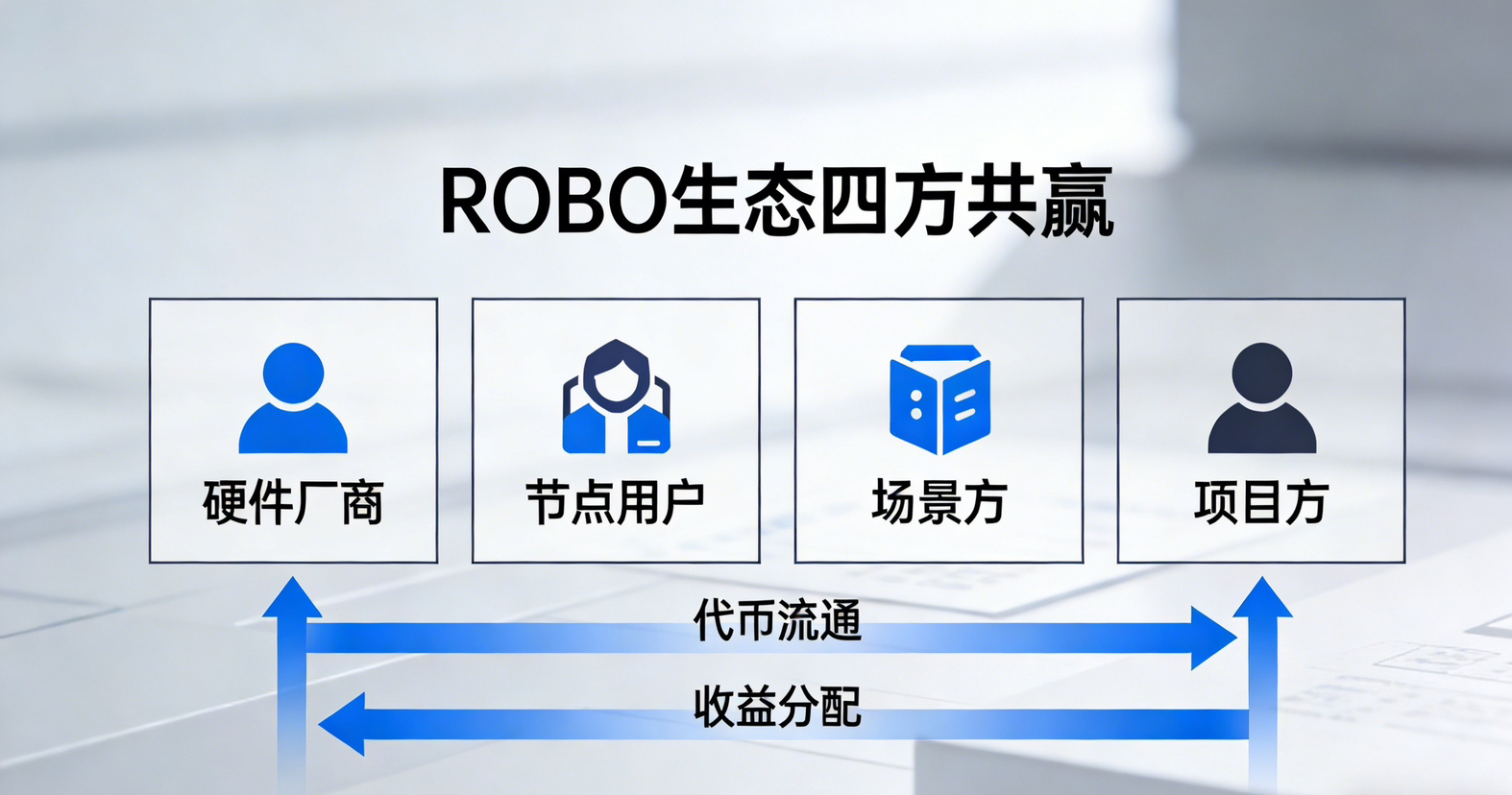 第一个全新视角:生态协同不是“多方参与”,而是“多方共赢”,打破“零和博弈”。很多项目的生态协同,只是“表面协同”——硬件厂商提供机器人,用户部署节点,场景方付费使用,看似多方参与,实则是“零和博弈”:项目方赚手续费,硬件厂商赚销售利润,用户只能靠代币炒作盈利,场景方的成本并没有真正降低。而ROBO的生态协同,核心是“多方共赢”,构建了一个“正向循环”的生态闭环。