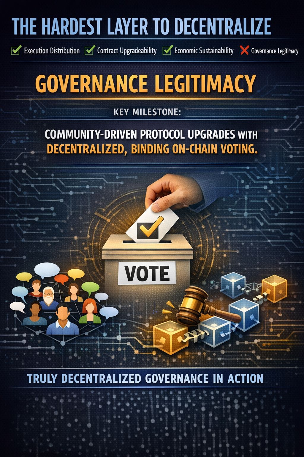 Of the four layers in the checklist — execution distribution, contract upgradeability, economic sustainability, and governance legitimacy — which one do you think is the hardest for an automation protocol to genuinely decentralize, and what specific milestone would convince you that a protocol had actually crossed that threshold?