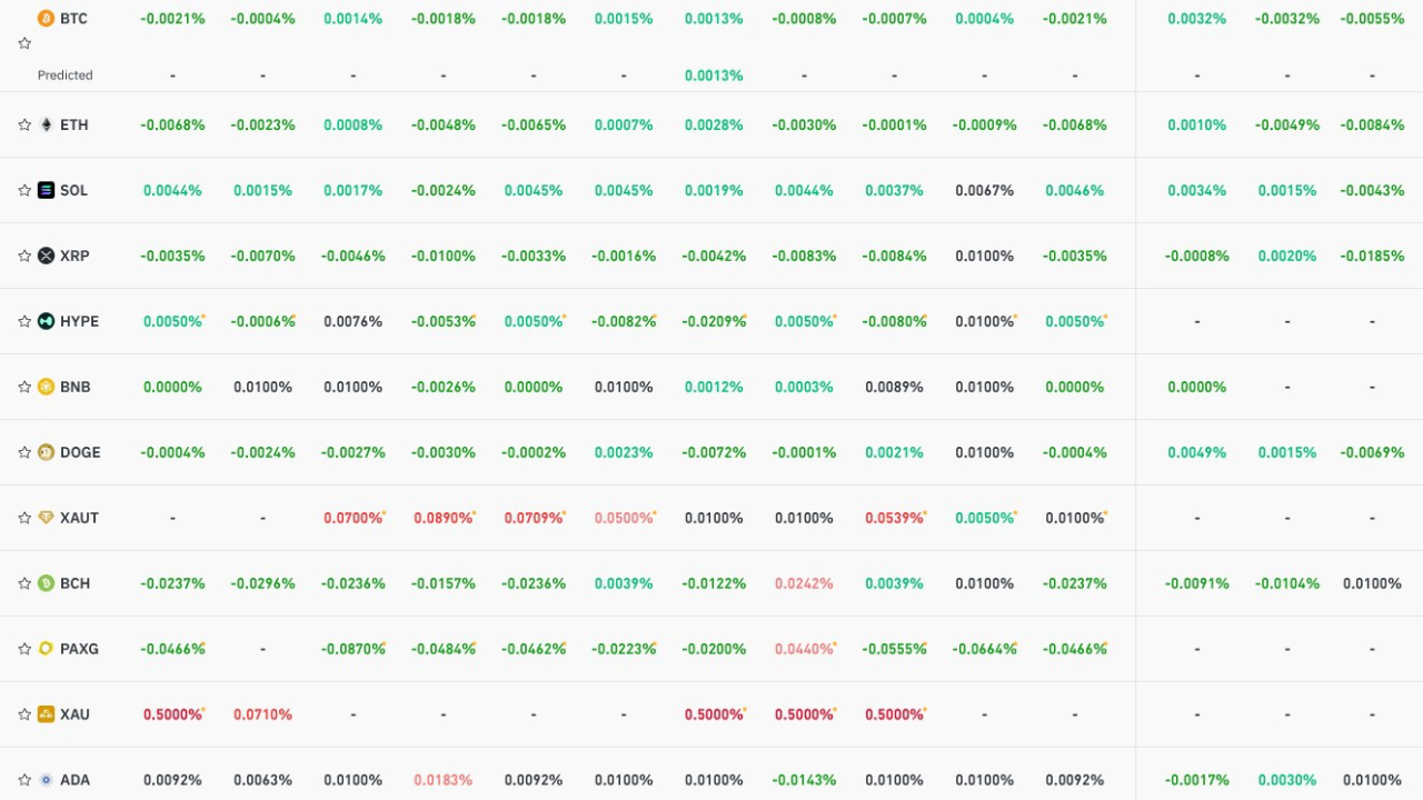 Większość głównych par — $BTC , $ETH , $SOL , XRP, BNB — notują bardzo niskie lub nieznacznie negatywne finansowanie na giełdach.