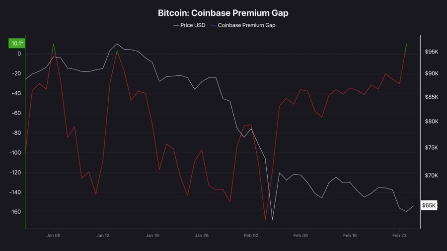 The Coinbase Premium Gap, which measures the price difference between Coinbase Advanced and Binance, has flipped positive again at +$10.18.