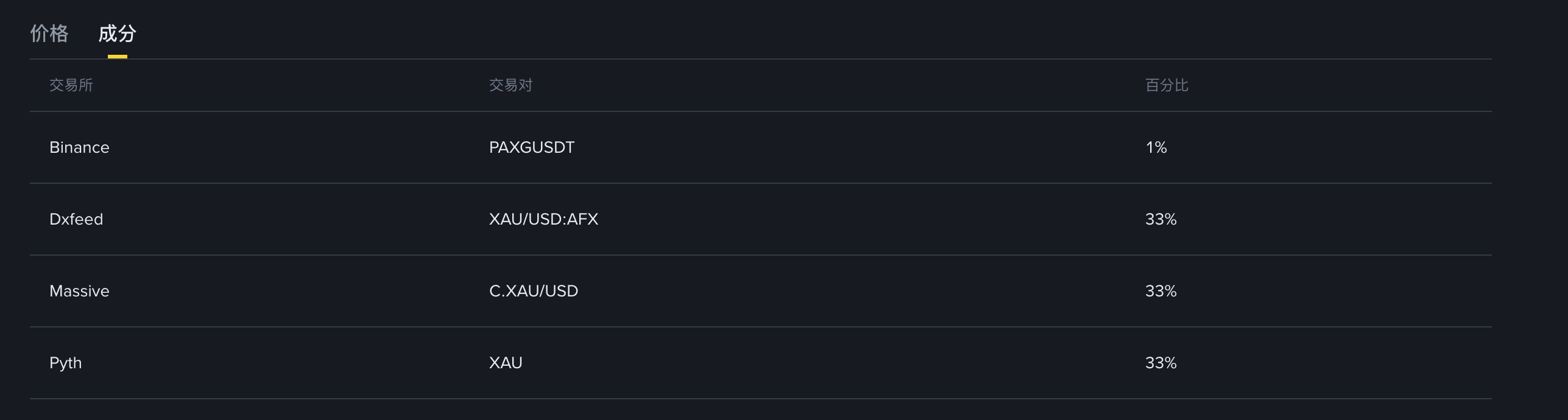 -第二部分是 DxFeed 提供的 XAU/USD 数据源,权重约 33%。该数据源属于传统金融市场的报价接口,提供场外黄金美元价格,作为传统市场定价锚之一。