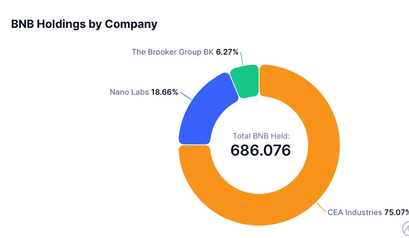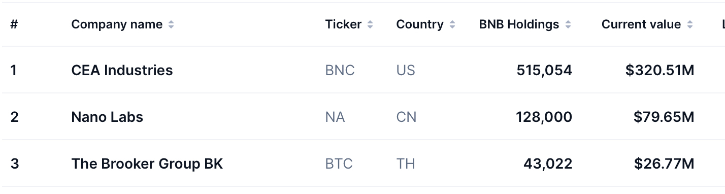 Theo dữ liệu gần đây, công ty đại chúng nắm giữ lượng BNB lớn nhất được biết đến là CEA Industries, với ước tính 515.054 BNB, trị giá khoảng 320,4 triệu USD. Những con số này dựa trên các thông tin công khai và có thể thay đổi khi các công ty điều chỉnh danh mục đầu tư của họ.