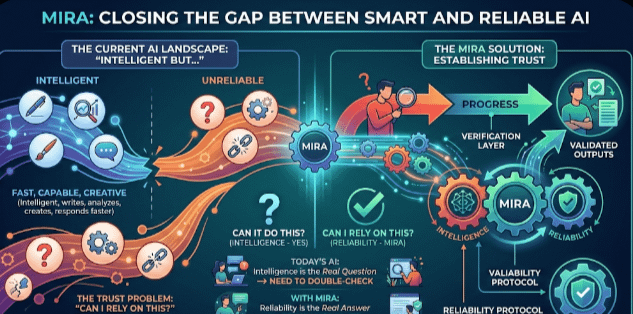 Mira nie stara się zbudować lepszego modelu. Nie konkuruje z LLM. Zamiast tego koncentruje się na czymś głębszym — przestrzeni między wynikami AI a zaufaniem.