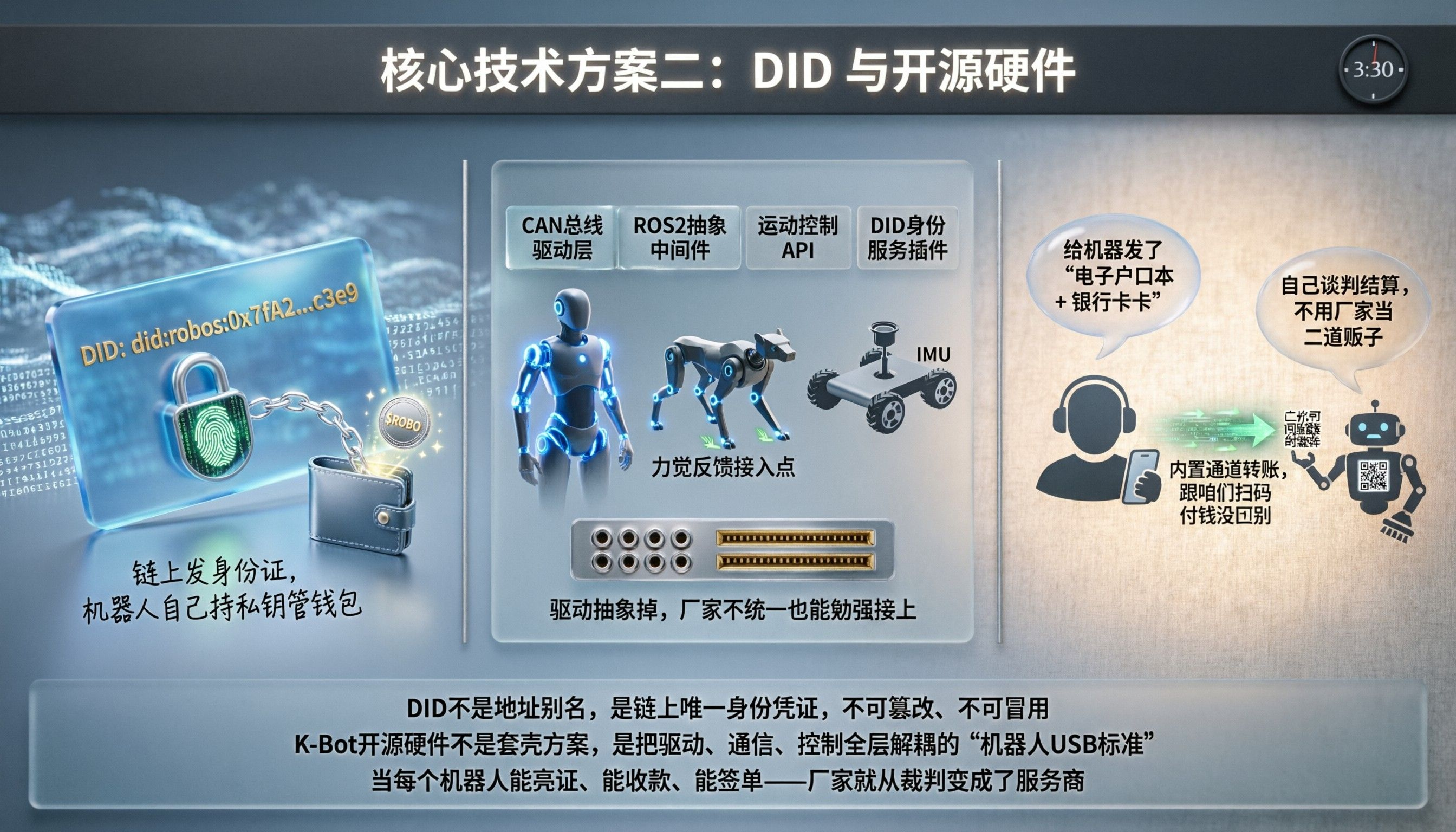 再就是 DID,链上发身份证。机器人自己持私钥管钱包,内置通道转账,跟咱们扫码付钱没区别。K-Bot 那套开源硬件把驱动抽象掉,人形、四足、轮式随便换,厂家不统一也能勉强接上。广场有人吹这是给机器发了“电子户口本 + 银行卡”,自己谈判结算,不用厂家当二道贩子。#ROBO