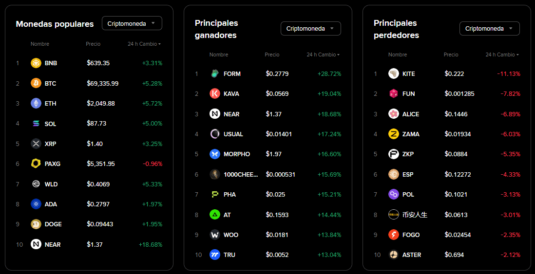 Bitcoin (BTC): Lidera el rebote cotizando en $69,342 con una subida del +4.81% en las últimas 24 horas.