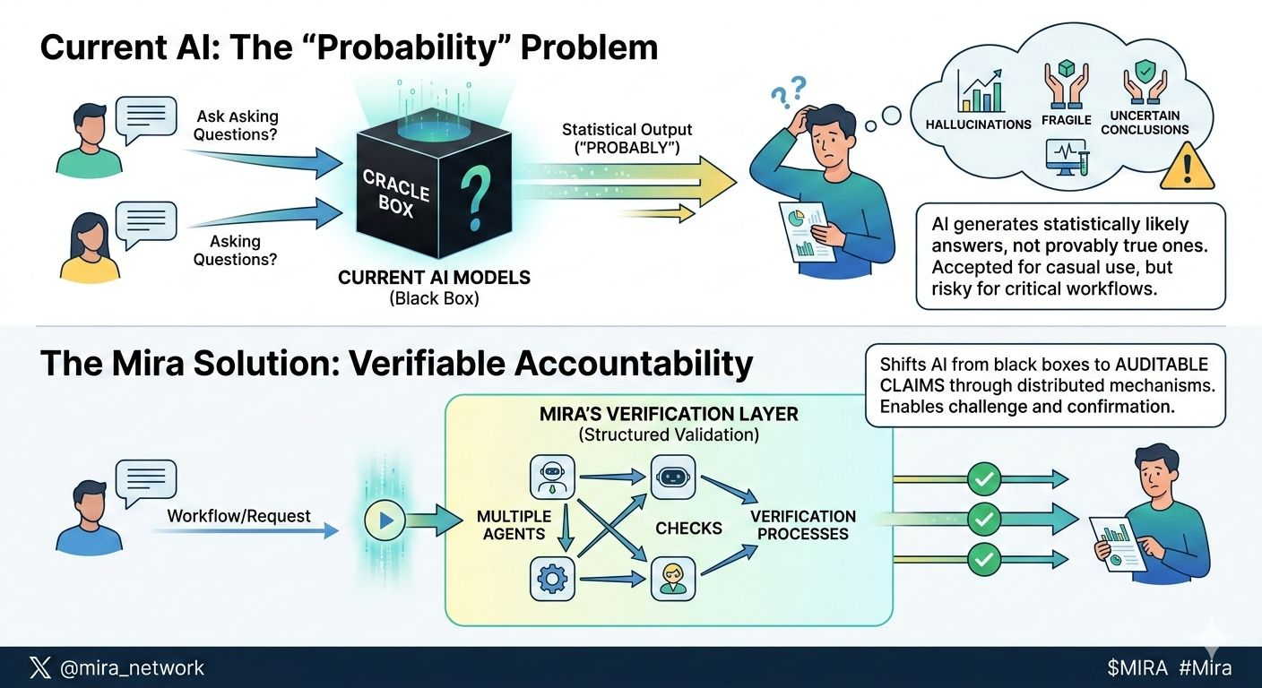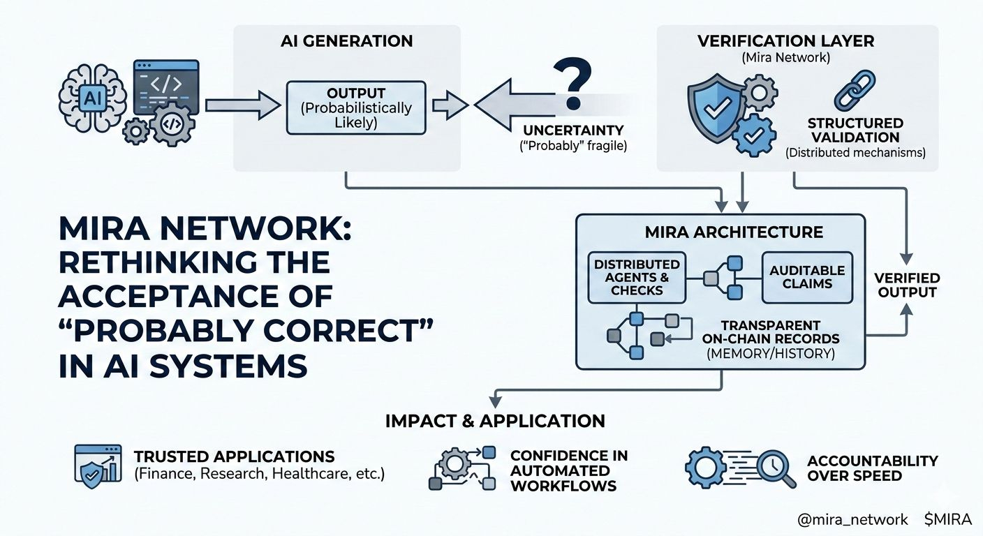 When I first started looking closely at Mira Network, what stood out wasn’t throughput metrics or abstract decentralization rhetoric. It was a discomfort with something most of us have already normalized. AI systems today operate on probability. They generate answers that are statistically likely, not provably true. For casual use, that’s fine. But as AI moves into finance, research, healthcare triage, and autonomous workflows, “probably” begins to feel fragile.